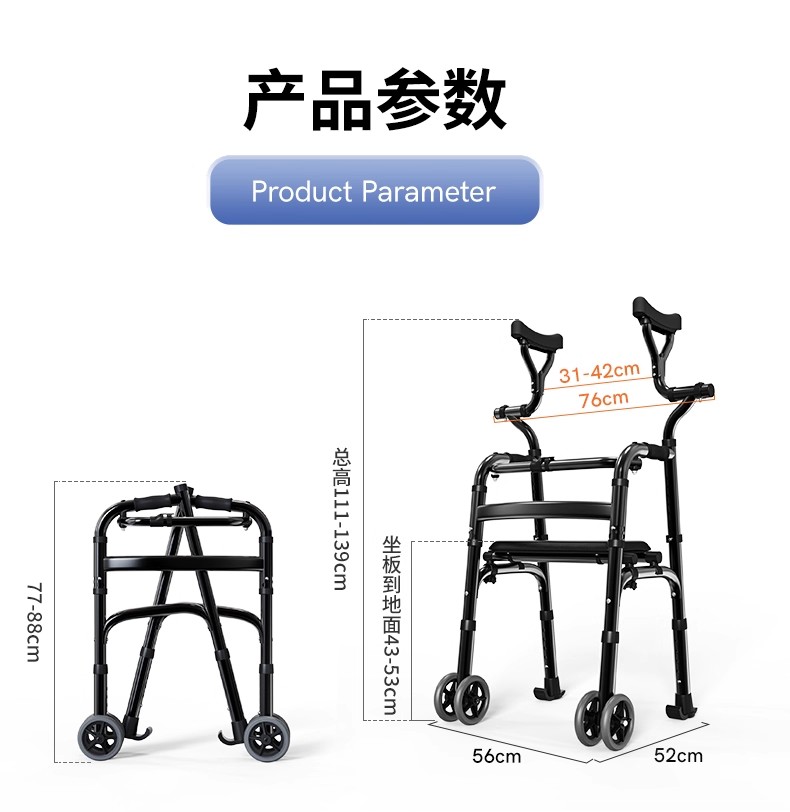 特点:软质腋托:无需要弯腰、结实耐用;一键折叠:不占空间、便于收纳;高度可调:适合不同身高人群使用。可翻坐板:累了可随时休息。
